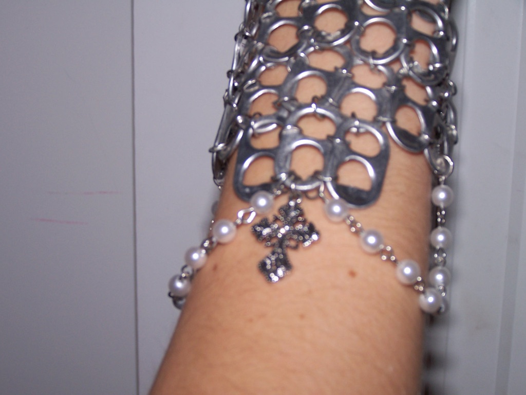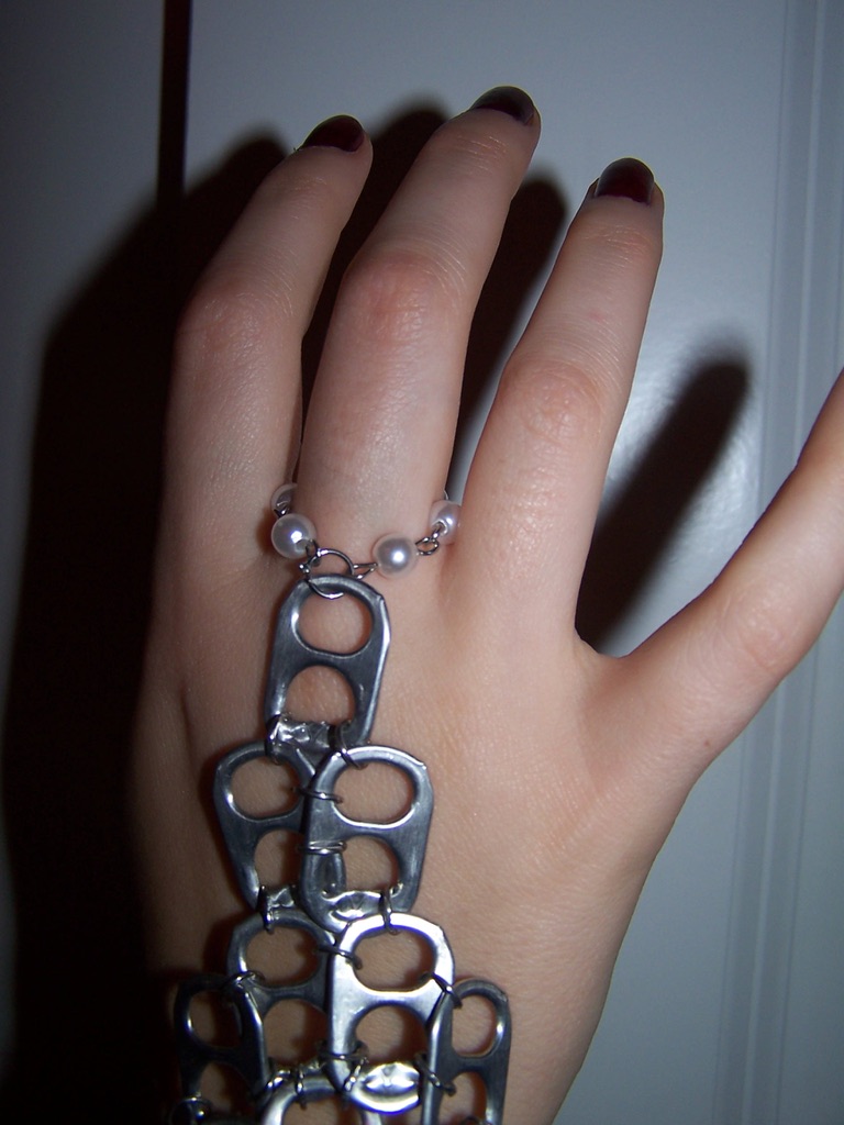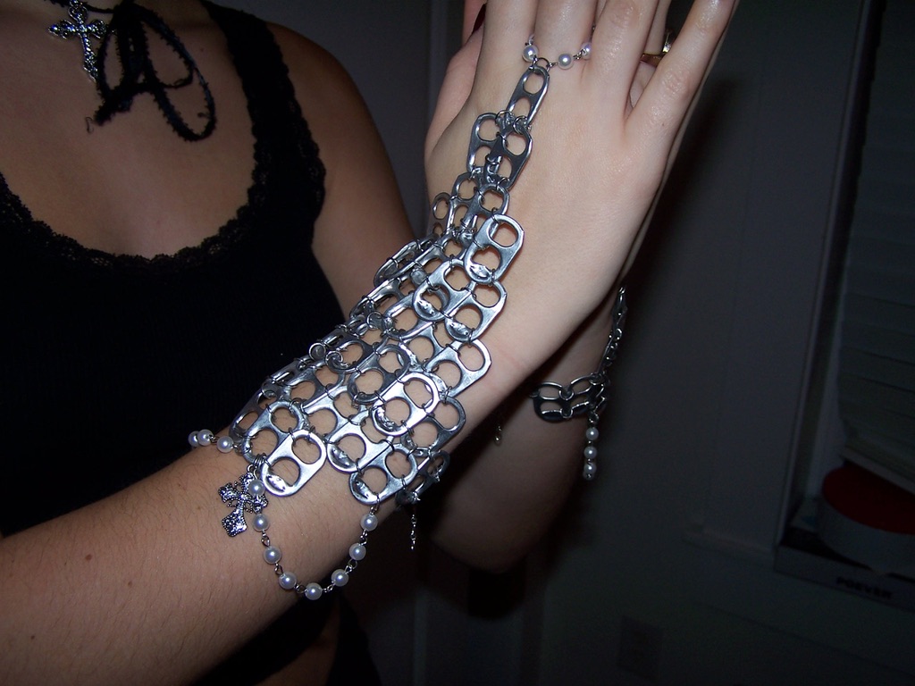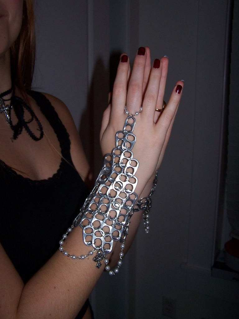 Context: To make these gloves I collected soda can tabs and linked them together using jump rings. To secure the rings I soldered them closed. I followed a triangular glove shape to create the pattern and added details for function and aesthetics.