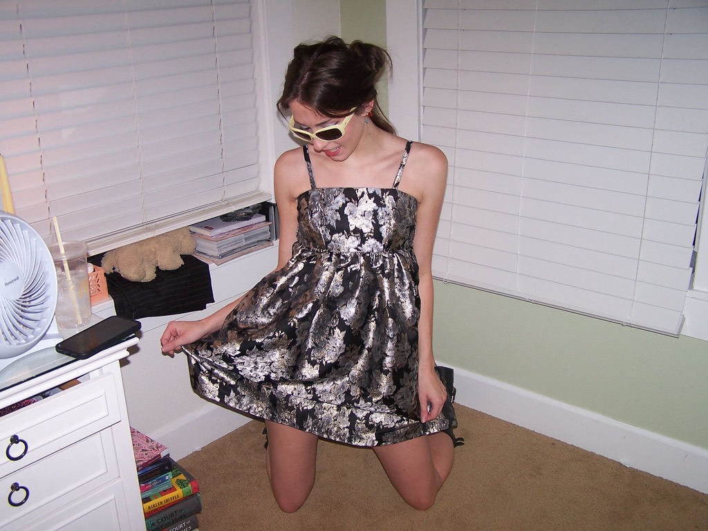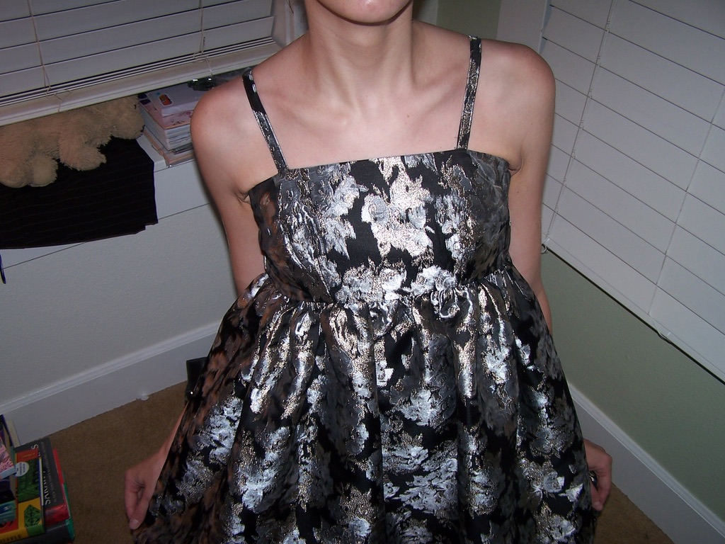 Context: After seeing Ariana Grande on The Tonight Show in 2018, wearing a pink Cecilie Bahnsen babydoll dress, I was inspired to recreate it. This is my interpretation, crafted from a silver and gold metallic jacquard fabric.